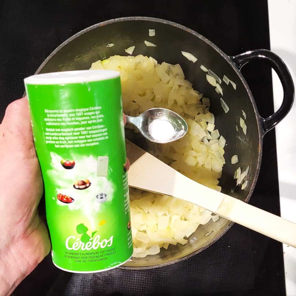 Door een beetje natriumbicarbonaat toe te voegen maak je de uien alkalischer (minder zuur). Ze zullen sneller slinken en makkelijker bruin worden.
