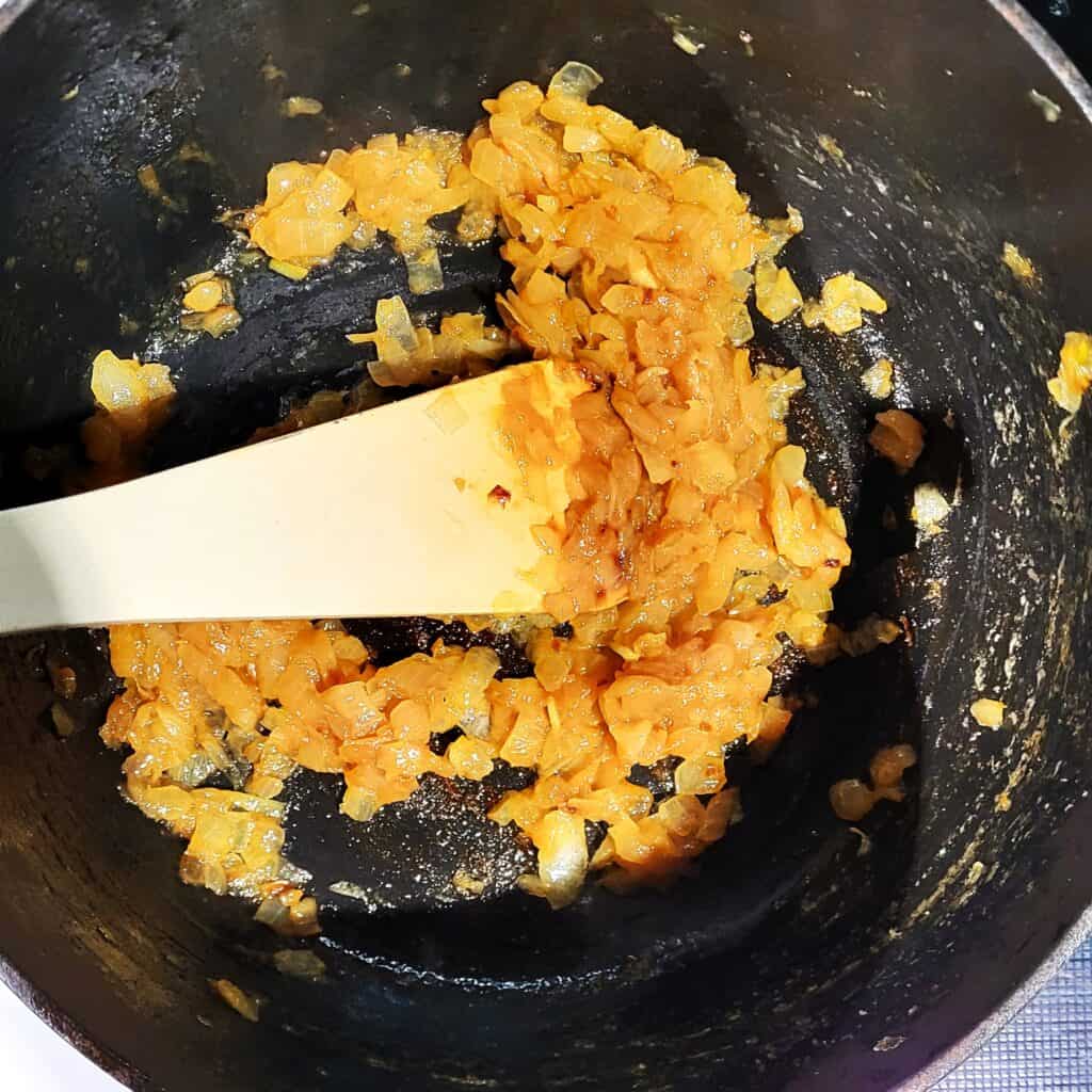 Bak, ook al voeg je natriumbicarbonaat toe, de uien lang en langzaam om de zoete uiengeur die we allemaal lekker vinden te voorschijn te laten komen.