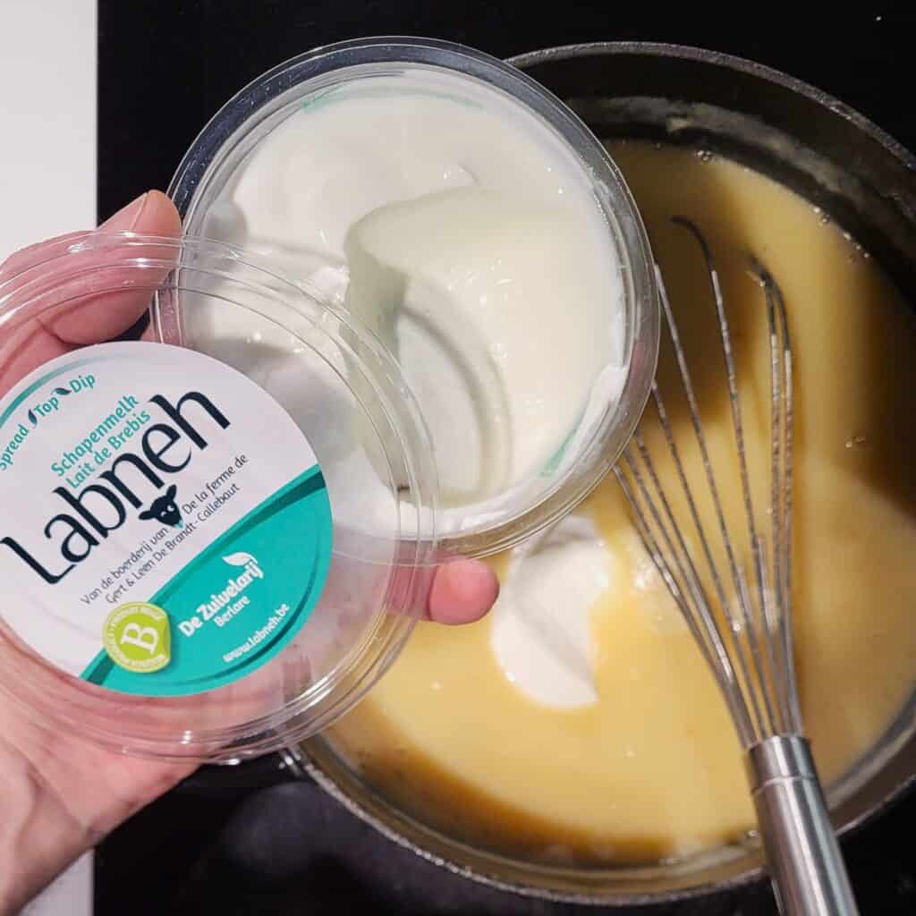 Voeg de geplette aardappelen toe aan de uiensoep en roer goed door elkaar. Voeg 200 gram labneh toe (of zure room als je labneh niet kan vinden) samen met 100 gram lichte room. Roer en verwarm tot tegen het kookpunt.