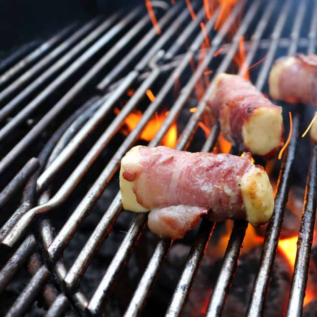 Kaas op de barbecue kan zeker. Het is een lekkere vleesvervanger op de BBQ. Maar ook omwikkeld met een lapje fijn ontbijtspek is het geweldig. Als het spek een beetje gaat krimpen door de hitte komt de kaas uit het spekje en zal hij mooi mee grillen. Gebruik altijd fijn gesneden spek