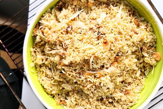 Meng 500 gram voorgesneden witte kool met een koffielepel zout en meng goed door elkaar. Laat een half uurtje staan in de koelkast en knijp er vervolgens het water uit. Kook of wel 500 gram couscous zoals op de verpakking staat aangegeven. Doe de couscous in een grote kom en maak de korrels los met de handen. Voeg ondertussen 30 gram notenolie (of amandelolie) toe. Rooster 250 gram amandelschilfers in de oven of op een pan maar laat ze niet verbranden. Meng de couscous, de amandelschilfers en de witte kool door elkaar. Voeg terwijl je mengt ook citroensap of appelazijn naar smaak toe. De tabouleh kan je warm, lauw of koud eten.