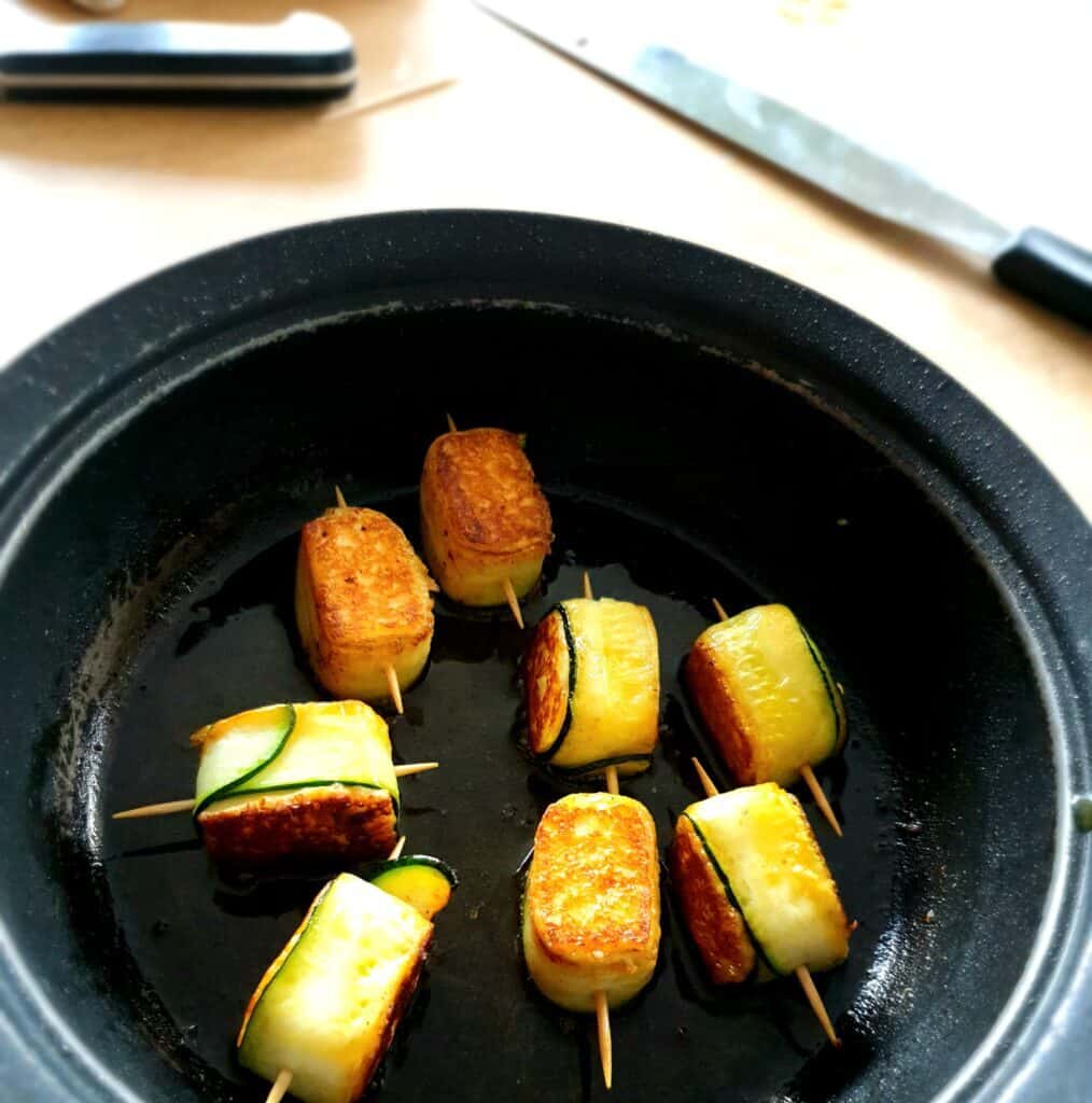 Voor een vegetarische oplossing kan je de stukjes Berloumi ook in courgettesliertjes wikkelen en ze aan de kaaskant aanbakken.