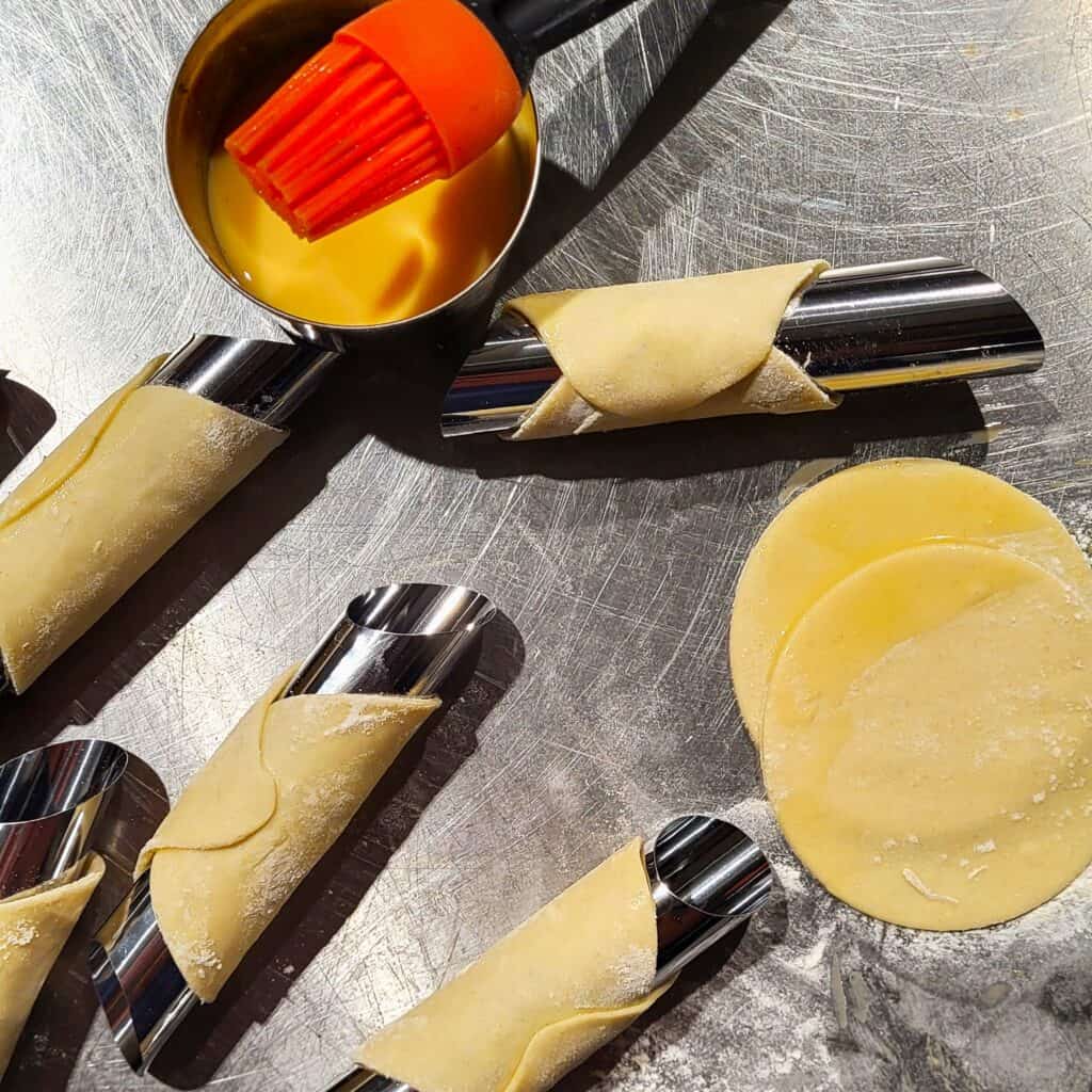 Door de cannoli dakpansgewijs op elkaar te stapelen kan je ze makkelijk instrijken met ei of eiwit. Rol ze nadien niet al te strak rond de cannoli buisjes. Je kan ze zelfs heel los rond de buisjes plooien voor een wat andere cannoli vorm.