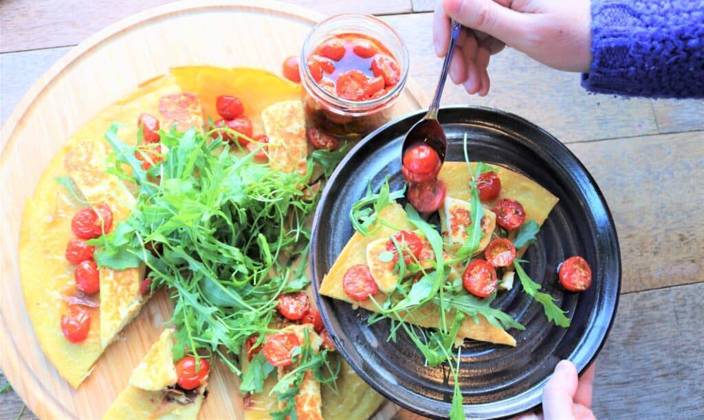Wij werken onze Farinata natuurlijk af met Berloumi. Wat krokante, pittige sla en intens smakende, half gedroogde kerstomaatjes.