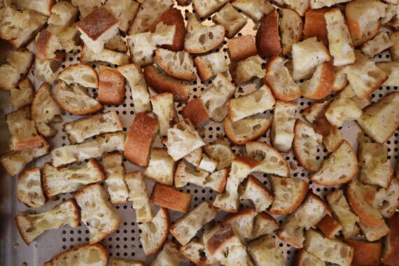 Snij of scheur ongeveer 400 g brood in ongelijkmatige stukken. Gebruik een goed, luchtig brood zoals ciabatta. Meng het brood met 4 cl olijfolie en droog/bak het brood gedurende vijftien tot twintig minuten in een oven van 160°C. Laat het brood slechts licht bruin worden en laat nadien die oven open staan met het brood er in. Het brood moet hard geworden zijn. Verzamel al je broodkruimels van de snijplank en gooi ze in de vinaigrette.