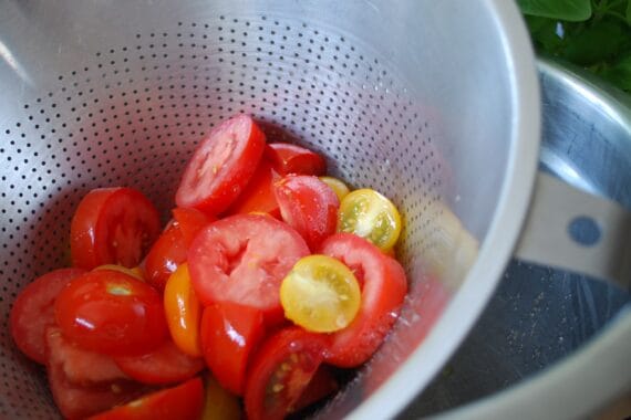 Snij 600 g tomaten van verschillende allure in willekeurige stukken. Bestrooi met 8 g zout, meng kort en laat vervolgens op kamertemperatuur uitlekken in een zeef. Vang het vocht dat vrijkomt op om het nadien te kunnen gebruiken. Het vocht en de tomaten zullen zout zijn maar dit is het enige zout dat in het recept wordt gebruikt.