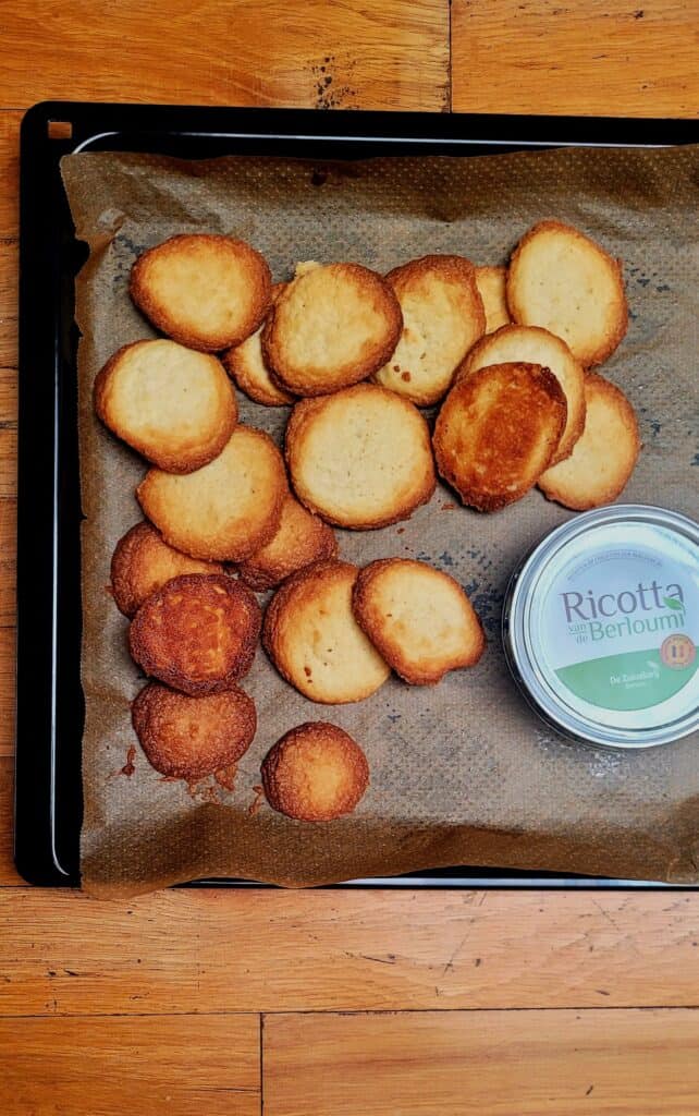 De ricotta in dit recept komt uit onze Zuivelarij. Waag het niet om andere ricotta dan de Ricotta van Berloumi te gebruiken! De ricottakoekjes mislukken dan zeker, en zijn sowieso niet lekker want de samenstelling van elke ricotta is natuurlijk anders.