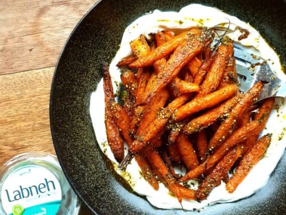 Voor de oven kan je de wortelen mengen met specerijen. Na de oven kan je nog wat verse kruiden gebruiken. Serveer ze met onze labneh of bak Berloumi en leg die er bij op de ovenplaat.
