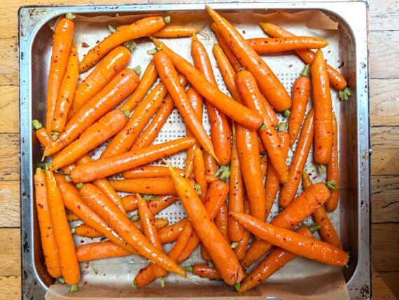 Deze zwarte, verschrompelde stukjes zijn exact wat we willen. Om het effect te versterken zou je tien minuten voor het einde nog wat honing door de worteltjes kunnen doen maar geroosterde wortelen op deze manier zijn op zichzelf al zoet genoeg.